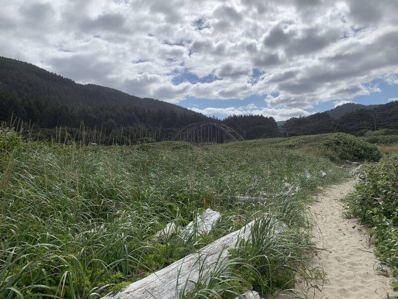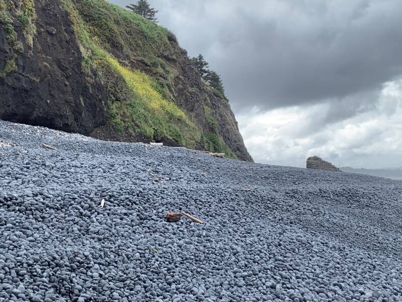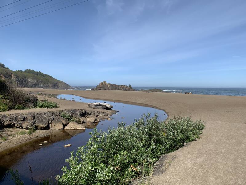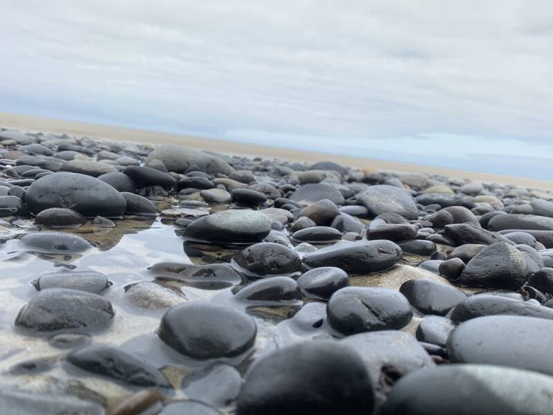 Stonefield Beach. What a cool place. It’s pretty much right off the highway. You park and walk down a sand and driftwood path to get to an opening. There’s this area with all these cobblestones and then a little further out is the ocean. Also, there’s a creek running through that empties into the Pacific Ocean.